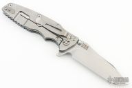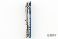 This Eklipse by Rick Hinderer features a stonewash finished blade with notched thumbrest and flipper. The handle has a stonewashed titanium frame, black/blue G-10 scale, satin hardware, and a tip up or down reversible stonewashed and titanium clip and filler tab, lanyard hole at the butt. New condition. Comes with original box and extra pivot hardware.