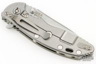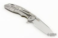 This XM-18 by Rick Hinderer features a stonewash finished blade with notched thumbrest and flipper. The handle has a stonewashed titanium frame with OD Green G-10 scale, and a tip up or down reversible titanium clip, pivot, and filler tab, lanyard hole at the butt. Comes with original box and extra hardware. New condition.