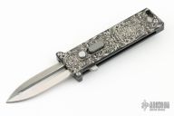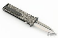 The Tallin is a sleek, California Legal Single Action Automatic knife.  The Blade is a little under 2 inches in Stainless steel with a dagger grind  – a blade that screams tactical and combat but with the clean elegant lines of pure harmony.  The handle is titanium that is laser engraved.  Comes with original box. Excellent condition.