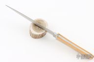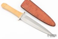 This Arkansas Toothpick by Jimmy Lile features a hand rub satin finished double edged blade, .184" blade stock and 1.125" blade depth, full tapered tang construction. The handle has a nickel silver double guard, yellow paper micarta scales and nickel silver pins. Comes with a brown leather sheath with boot clip. Excellent condition.