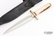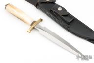 The Model 2-8 by Randall Made Knives is a heavily made dagger or dirk. The handle has a lugged brass guard, stag grip, scalloped brass butt cap and collar, black spacers. Double-edged satin finished blade, .210" blade stock and 1.188" blade depth, hidden tang construction. Comes with a black leather Randall sheath but it is for a Model 1-8. Has "A. SCALA" on the blade. Has a couple of light scratches and patina spots, otherwise excellent condition.