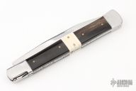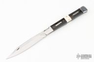 This slipjoint features a mirror polished blade with nail nick and fileworked spine. The handle has steel bolsters and liners, buffalo horn and fluted mammoth ivory scales with nickel silver escutcheons, fileworked steel backspacer. Has a couple light scratches, otherwise excellent condition.