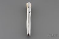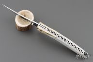 This linerlock features a mirror polished blade with a single thumbstud with mother of pearl inlay. The handle has stag bolsters with carved mother of pearl scales, stainless steel liners and fileworked backspacer. Nice blade seating and lockup. There is a screw missing on the b-side of the knife, otherwise excellent condition.