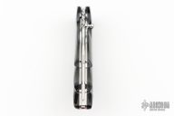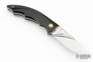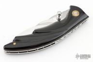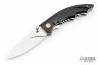 This linerlock features a mirror polished blade with a single thumbstud. The handle has carved buffalo horn scales, fileworked stainless steel liners and backspacer. Nice blade seating and lockup. Excellent condition.