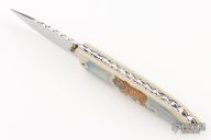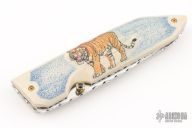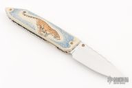 This linerlock features a mirror polished blade with a single thumbstud with blue stone inlay. The handle has scrimshawed tan G-10 scales with scrimshaw, fileworked stainless steel liners and backspacer. Nice blade seating and lockup. Excellent condition.