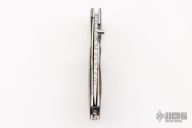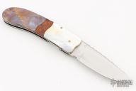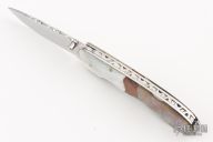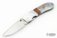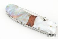 This linerlock features a mirror polished blade with a single thumbstud. The handle has mother of pearl bolsters, abalone scales with a wood band, stainless steel liners and fileworked backspacer. Nice detent, blade seating and lockup. Excellent condition.