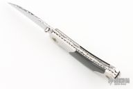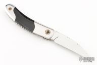 This linerlock features a mirror polished blade with a single thumbstud. The handle has stainless steel bolsters, buffalo horn scales, fileworked stainless steel liners and backspacer. Nice detent, blade seating and lockup. Excellent condition.