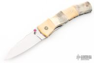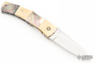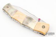 This linerlock features a mirror polished blade with fileowrked spine and a single thumbstud with red stone inlay. The handle has multi-piece pearl scales, fileworked stainless steel liners and backspacer. Nice detent, blade seating and lockup. Excellent condition.