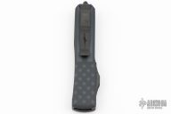 This Ultratech OTF automatic features a D/E black blade with full serrations. The handled features a black aluminum frame with USA Flag motif a tip down reversible stainless steel clip. Glass breaker. Comes with original box and papers. New condition.