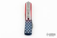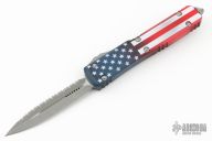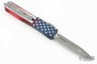 This Ultratech OTF automatic by Microtech features an Apocalyptic finished double edged blade with a fully serrated edge and satin finished flats. Red, white and blue aluminum contoured frame with a tip down stainless steel clip. New condition. Comes with original box and papers.