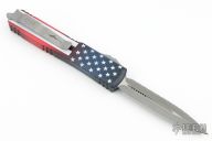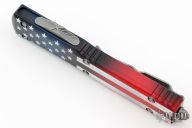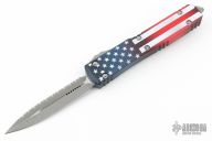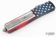 This Ultratech OTF automatic by Microtech features an Apocalyptic finished double edged blade with a fully serrated edge and satin finished flats. Red, white and blue aluminum contoured frame with a tip down stainless steel clip. New condition. Comes with original box and papers.