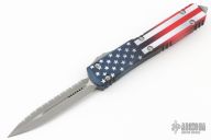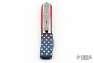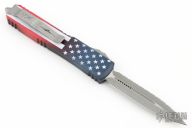 This Ultratech OTF automatic by Microtech features an Apocalyptic finished double edged blade with a fully serrated edge and satin finished flats. Red, white and blue aluminum contoured frame with a tip down stainless steel clip. New condition. Comes with original box and papers.