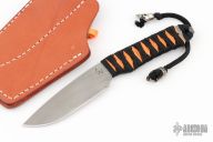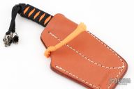 This Fixed Blade and Microdashi by Gavko Knives features a tumble finished chisel ground blade with .133" blade stock and .982" blade depth, full tang construction with flat paracord wrapped handle. Comes with a tumbled and anodized titanium microdashi, .157" blade stock and .498" blade depth, 1" blade length, 3.75" overall. Comes with a brown leather sheath. Excellent condition.