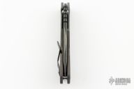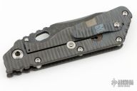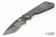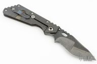 This XL framelock folder by Mick Strider features a dark stonewashed partially serrated blade and a flamed titanium frame and tip up titanium clip. Includes a "Lock Bar Stabilizer" for maximum reverse lock retention. Nice detent, lockup and blade seating. New condition. Comes with a zippered case.