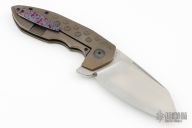 This Capitalist flipper from Custom Knife Factory features a light bead blasted blade with a false top edge. The handle features a tumbled titanium frame with orange peel finished titanium scale and backspacer. Black Timascus tip up pocket clip. Includes padded case, extra hardware and COA dated 2/2022 and #43.  Excellent Condition.