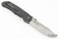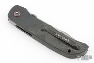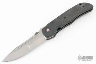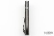 This Eagle Rock linerlock is from Custom Knife Factory and designed by Bob Terzuola. It features a bead blast finish multi-ground blade with fullers and false top edge, notched thumbrest and a thumbdisc. The handle has Timascus pivot collars, black bolsters, carbon fiber scales, black titanium liners, black backspacer, tip up black titanium clip. Nice blade seating, detent, and lockup. Comes with a zippered case and COA dated 3/23 and #243. Excellent condition.