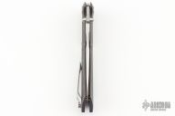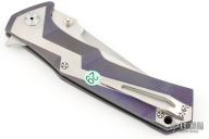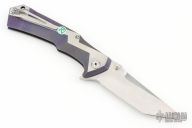 This button lock flipper from Brian Tighe features a hand rub satin finished blade with dual thumbstuds and flipper. The handle is milled and anodized titanium and features a milled clip positioned for tip up carry. Nice lockup and blade seating. Comes with a nylon zippered case. Excellent condition.