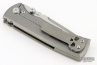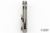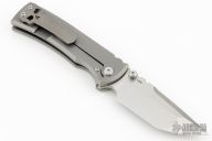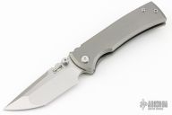This Chaves Ultramar Redencion Tanto features a satin finished blade with the Chaves logo, dual thumbstuds, and notched thumbrest. The handle is made up of tumbled titanium, skull pocket clip (positioned for tip up carry), and a matching titanium backspacer. Has overtravel stop. Blade is centered when closed, and locks up with no play. Comes with box and additional clip. Excellent condition.
