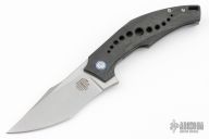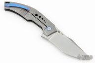 This SOS Flipper by Mechforce is a Tashi Bharucha design, it has a stonewashed blade with satin flats, notched thumbrest and flipper. The handle has a carbon fiber and bead blasted titanium frame with blue anodized titanium pivot collars and tip up clip. Rides on bearings, nice detent, lockup and blade seating. Comes with original box. Excellent condition.