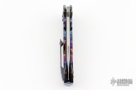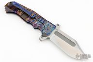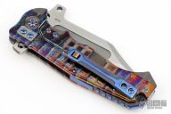 This ADV Badlands framelock flipper has a satin finished blade with swedge, fullers, notched thumbrest and flipper. Handle has an anodized titanium frame, titanium backspacer and tip up clip with roller, bronzed hardware. Rides on bearings, nice smooth action, detent, lockup and blade seating. Comes with a zippered case. Excellent condition.