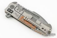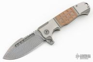 This ADV Harpoon framelock flipper has a Damascus blade with thumbdisc and flipper. Handle has a titanium frame, copper inlays, titanium backspacer with copper inlay and two-tone titanium tip up clip. Has stainless steel lockbar insert and lockbar stabilizer. Nice smooth action, detent, lockup and blade seating. Comes with a nylon zippered case. Excellent condition.