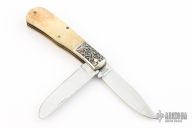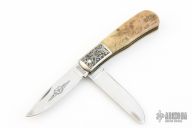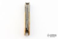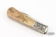 This slipjoint by Sam Maxwell features mirror polished blades with nail nicks. The handle has nickel silver bolsters, bone covers, brass liners and steel springs. Has scrimshaw. Has half-stops. Has some light scratches, otherwise good condition.