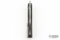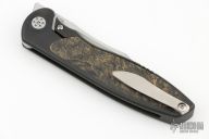 This Mini Tempest from Brian Nadeau features a hand rub satin finished bowie blade with a fuller and notched thumbrest/front flipper. The handle has a black PVD titanium frame with Gold Dark Matter FatCarbon inlays, satin titanium tip up clip. Nice detent, lockup and blade seating, stainless lockface insert. Includes original box. Excellent condition.