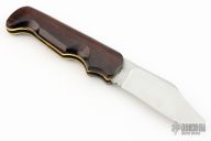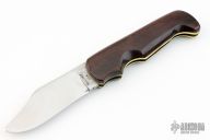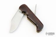 This Folding Hunter by A. Daniel Valois features a satin finish blade. The handle has desert ironwood scales, brass liners, and a steel backspacer and lever that unlocks the knife. Has good function. Has a few light scratches, otherwise excellent condition.