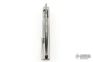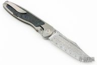 This Mini Tempest from Brian Nadeau features a Damasteel bowie blade with a fuller and notched thumbrest/front flipper. The handle has a bead blasted titanium frame with Blue  Dark Matter FatCarbon inlays, satin titanium tip up clip. Nice detent, lockup and blade seating, stainless lockface insert. Includes original box. Excellent condition.