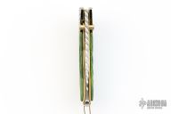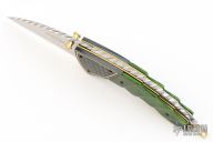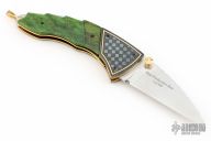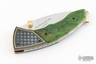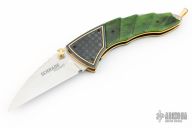 This SB2 LTD is a collaboration between Van Barnett and Schrade Cutlery. The knife features a satin finished wharncliffe blade with a fileworked spine, dual gold anodized titanium thumbstuds. The handle has blued stainless steel engraved bolsters with 24kt gold accent, green bone scales, 24kt gold plated stainless steel liners and a 24kt gold plated lanyard bail. Comes with a leather belt sheath. #0423 of 500. Excellent condition.