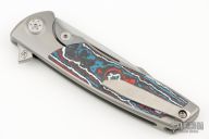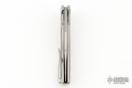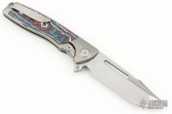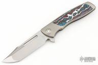 This Mini EVO Flipper from Brian Nadeau features a hand rub satin finished blade with a fullers, thumbhole, flipper and notched thumbrest. The handle is comprised of a bead blasted titanium frame with Nebula Fat Carbon inlays, satin titanium tip up clip. Rides on bearings, nice detent, lockup and blade seating, stainless lockface insert. Comes with original box. Excellent condition.