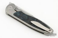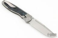 This Mini Tempest from Brian Nadeau features a hand rub satin finished drop point blade with a fuller and notched thumbrest/front flipper. The handle has a bead blasted titanium frame with Marvel Blue FatCarbon inlays, satin titanium tip up clip. Nice detent, lockup and blade seating, stainless lockface insert. Includes original box. Excellent condition.