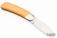 This Lockback by Shcrade Custom Series features a satin finished blade. The handle has nickel silver bolters, yellow paper micarta covers, brass liners and stainless spring. Excellent condition. #469