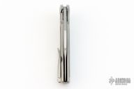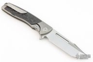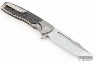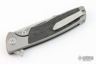 This Mini EVO Flipper from Brian Nadeau features a belt satin finished blade with a fullers, thumbhole, flipper and notched thumbrest. The handle is comprised of a bead blasted titanium frame with carbon fiber inlays, satin titanium tip up clip. Rides on bearings, nice detent, lockup and blade seating, stainless lockface insert. Comes with original box. Excellent condition.