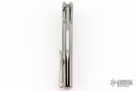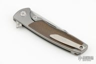 This Mini EVO Flipper from Brian Nadeau features a belt satin finished blade with a fullers, thumbhole, flipper and notched thumbrest. The handle is comprised of a bead blasted titanium frame with green canvas micarta inlays, satin titanium tip up clip. Rides on bearings, nice detent, lockup and blade seating, stainless lockface insert. Comes with original box. Excellent condition.
