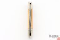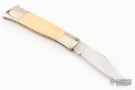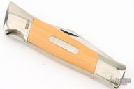 This Lockback by Schrade and George Wostenholm features a satin finished blade with nail nick. The handle has nickel silver bolsters with integral liners, yellow paper micarta covers, steel backspacer. M1617 on the bolster. Has some light scratches, otherwise excellent condition.