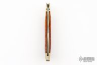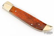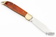 This knife by Steve Voorhis features a mirror polished blade with nail nick. The handle has nickel silver bolsters, jigged bone covers, brass liners and a steel spring. Has some light scratches, otherwise excellent condition.