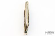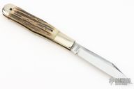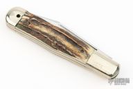 This knife by Taylor Cutlery features a mirror polished blade with nail nick. The handle has nickel silver bolsters, stag covers, brass liners, steel spring. Has some light patina, otherwise excellent condition. #0674