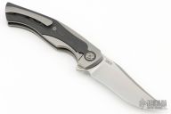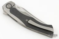 This Coyote Flipper Reate, designed by Emmanuel Le Brun features a two-tone finished blade with flipper. The handle has a blasted titanium frame and backspacer, carbon fiber inlay, titanium tip up clip. Very smooth. Nice detent, lockup and blade seating. Comes with original box and case. Excellent condition.