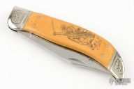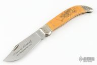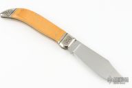 This slipjoint by Scrade Custom Series features a satin finished blade with nail nick. The handle has nickel silver bolters, yellow paper micarta covers, brass liners and steel spring. Has some oxidation on the spring, otherwise excellent condition.