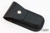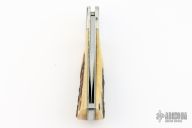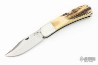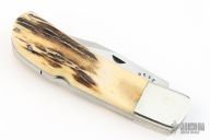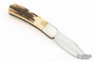 This J Lockback by Enedino De Leon features a satin finished blade with nail nick. The handle has dovetailed nickel silver bolsters, stag scales, nickel silver liners, stainless steel backspacer. Comes with a black leather sheath. Has some scratches, otherwise good condition.