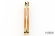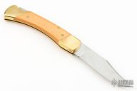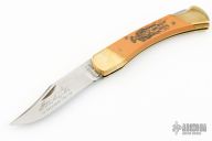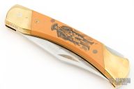 This lockback by Scrade Custom Series features a satin finished blade with nail nick. The handle has brass bolsters, yellow paper micarta covers, brass liners and steel backspacer. Excellent condition. #1043
