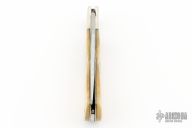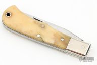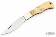 This slipjoint by Clyde Fischer features a mirror polished blade with nail nick. The handle has nickel silver bolsters and liners, bone covers and steel spring. Has half-stop. Has some light scratches and a crack in one of the scales, otherwise good condition.