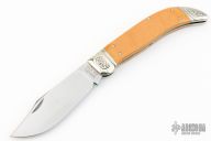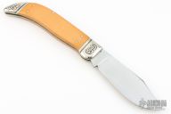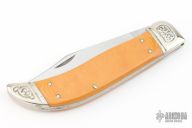 This slipjoint by Scrade Custom Series features a satin finished blade with nail nick. The handle has nickel silver bolters, yellow paper micarta covers, brass liners and steel spring. Has a couple light scratches, otherwise excellent condition.