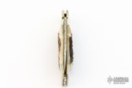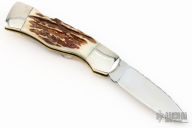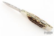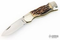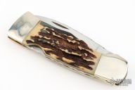 This lockback by "Stone" (please let us know if you know which Stone this is) features a satin finished blade with fileworked spine and nail nick. The handle has nickel silver bolsters, stag scales, brass liners, fileworked steel backspacer. Has a couple light scratches, otherwise excellent condition.
