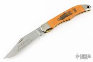 This linerlock by Shcrade Custom Series features a satin finished blade with nail nick. The handle has nickel silver bolters, yellow paper micarta covers, brass liners and steel spring. Has some light scratches, otherwise excellent condition. #0174