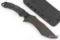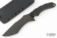This Lakedaemon from Krypteia Knives features a gun blued tanto recurve blade with swedge and notched thumbrest, .201" blade stock and 1.587" blade depth, full tang construction. The handle has black G-10 scales with lanyard hole. Comes with kydex sheath. Has a couple light scuffs, otherwise excellent condition.