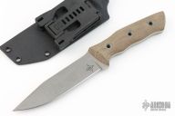 This Night Watch from Brian Efros has a tumble finished clip point blade with swedge, .176" blade stock and 1.120" blade depth, full tang construction. The handle has green canvas micarta scales. Bead blasted hollow pins secure the scales to the tang. Includes kydex sheath with tek lok. Excellent condition.