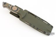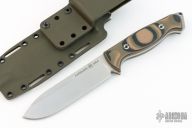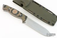 This Alpha from Ambush Knives features a drop point stonewash finished blade with .188" blade stock and 1.266" blade depth, full tang construction. The handle has G-10 scales and a lanyard hole. Includes a kydex sheath with belt loop. Excellent condition.
