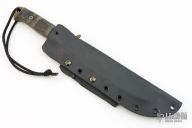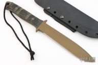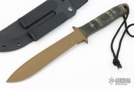 This knife by Barry Dawson features a bronze coated drop point blade with false top edge, .248" blade stock and 1.276" blade depth, full tang construction. The handle has black canvas micarta scales. Includes a black kydex sheath. Excellent condition.